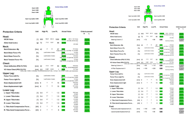子弹车黑色揽月假人伤害得分率100%满分,目标车蓝色揽月假人伤害98.8%,假人胸部扣分有受伤风险。如何解读?子弹车由于拥有充分的被动保护,尽管A柱有形变,但整体幅度并不大,假人在安全气囊防护下没有出现致命伤,因此得到满分意料之中。目标车蓝色揽月扣分主因在于,碰撞后子弹车有继续擦碰目标车驾驶员一侧车门的趋向,释放的撞击力势能通过车门侵入车内,假人胸部点位传感器在此时被撞击触发,最终评价为A良好。