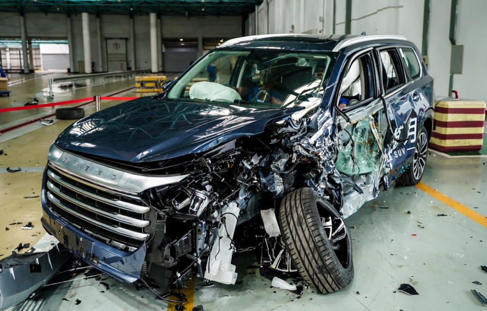 星途揽月在极端碰撞下,前悬架会迅速解体,这种好处在于轮毂不会对防火板进行过分侵入,这一点揽月做得很好,子弹车车轮飞了出去,虽然车辆外观惨了些,但这种“丢轮保命”的结构设计常出现在一些豪华车型中,比如说沃尔沃。