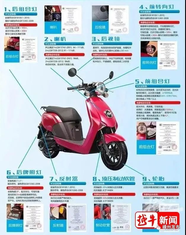 据了解,真正的3C认证,要求电动车除了整车外,还有九大部件需要3C认证,它们分别是:前组合灯、前转向灯、制动软管、后组合灯、后牌照灯、后视镜、反射器、轮胎、喇叭。
