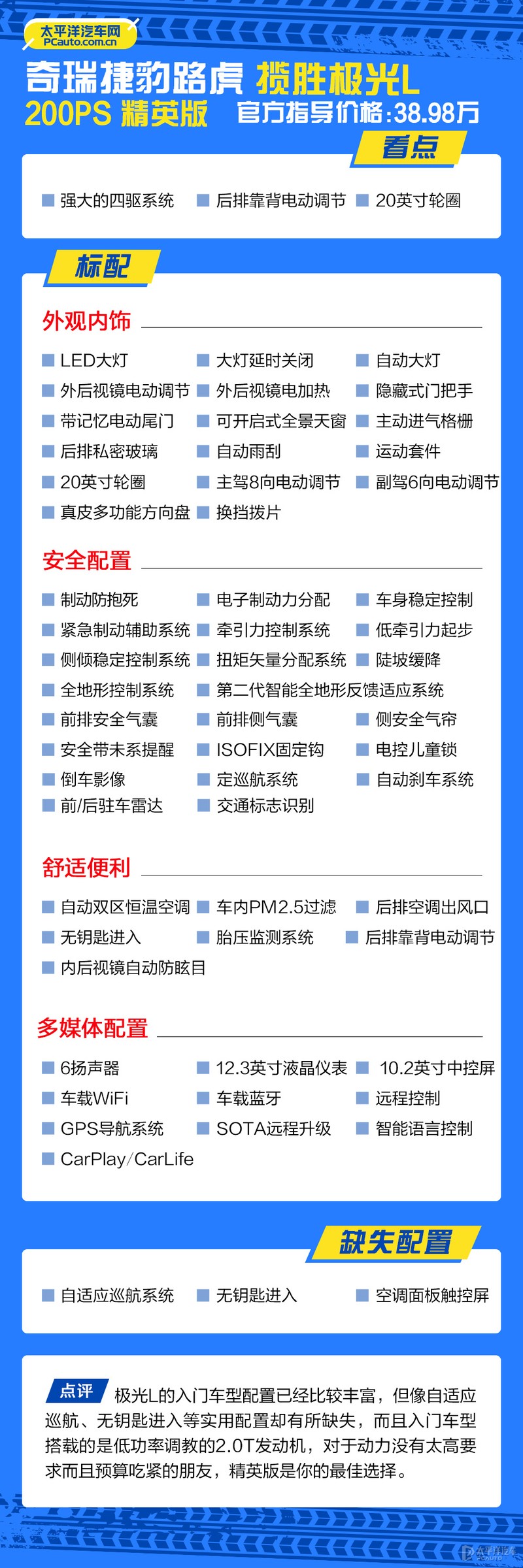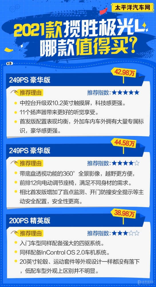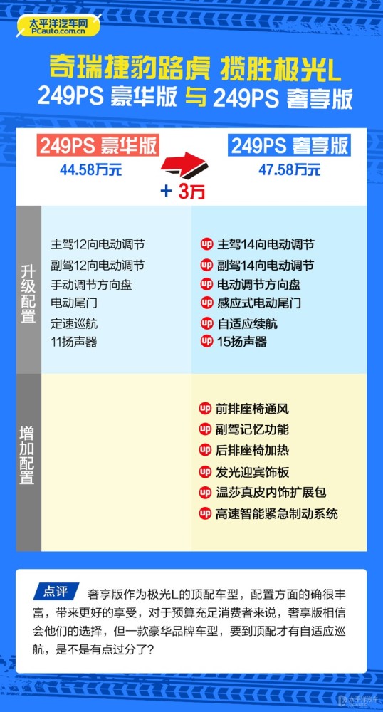 毫无疑问顶配车型249PS奢享版是极光L那么多车型当中配置最丰富的一款车型,甚至还拥有14向电动调节座椅等越级配置,但将近48万元的售价,都可以不少豪华品牌中大型SUV了,性价比并不高。