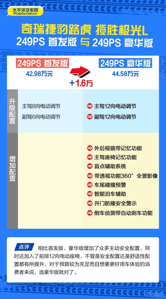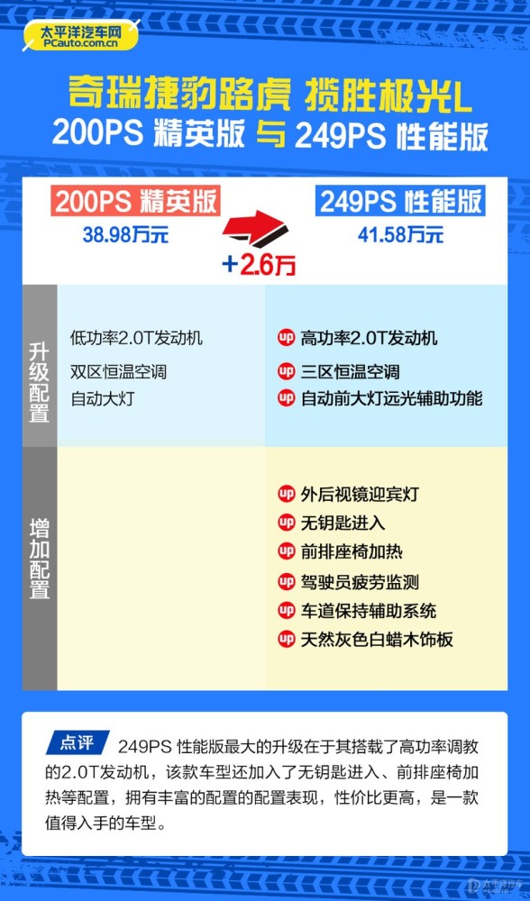 249PS性能版作为搭载2.0T高功率发动机的入门车型,相比低配车型除了提升了动力,也针对其它舒适配置进行了小幅度升级,2.6万元的溢价也在情理之中。