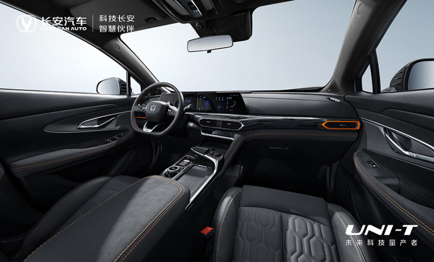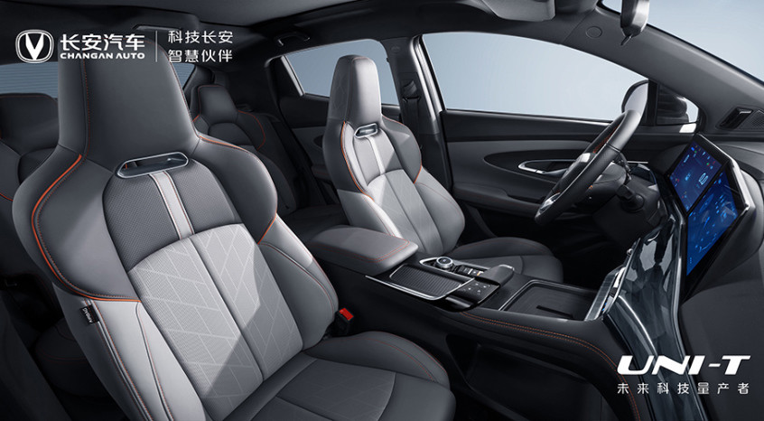 内饰方面,新款UNI-T的中控台采用了强调金属层次纹理的交叉拉丝面板,搭配黑色(带橙色缝线)与浅灰色两种内饰配色,营造出不错的内饰质感。另外,新款UNI-T升级为双12.3英寸智慧双联屏,FACE ID × 超级账号可以实现刷脸上车。此外,新款UNI-T的座椅表面采用了全新设计,运用了科技化打孔图案。