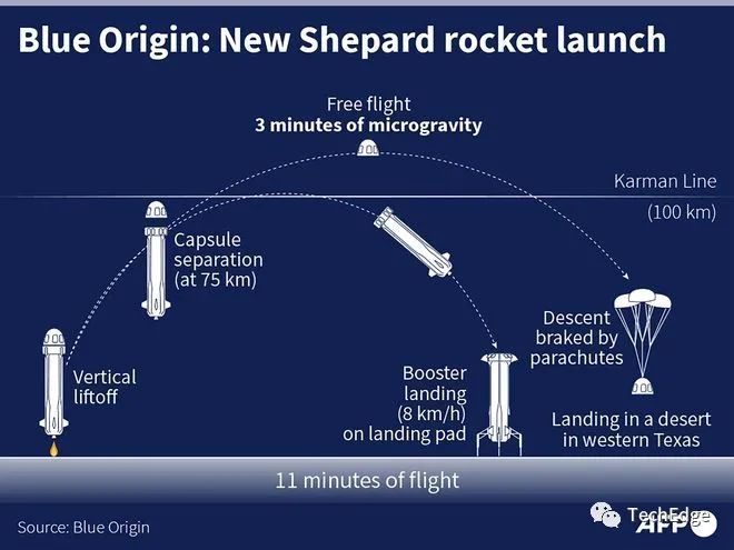 贝索斯的飞行大约会持续11分钟,在此期间,他和其他乘客将经历大约3分钟的失重。与贝索斯同行的还有他的弟弟马克·贝索斯(Mark Bezos)、82岁的女飞行员沃利·芬克(Wally Funk)以及荷兰18岁物理专业学生奥利弗·达曼(Oliver Daeman)。