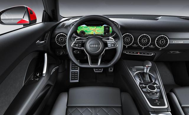 内饰方面,新TT的整体布局与现款没有明显区别,中控台没有液晶屏,三个圆形的空调出风口就像是战斗机的喷气口,非常战斗,所有的功能都被集成在了前方的12.3英寸的液晶仪表中,让驾驶员可以专注于视线前方。