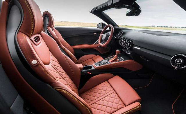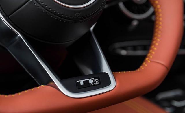 此外,20周年纪念版的TTS车型还拥有独特的棕色内饰,还配有黄色的缝线,方向盘上还有20周年纪念的小徽章,仪式感十足。