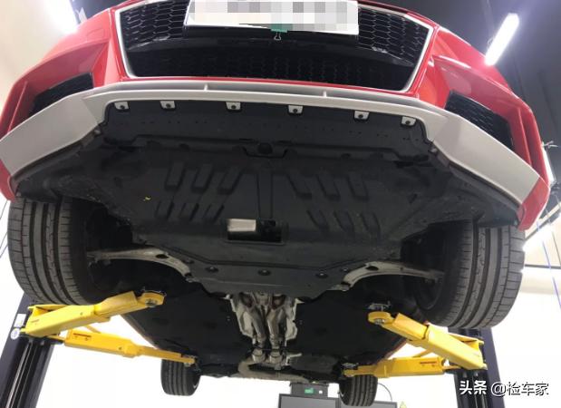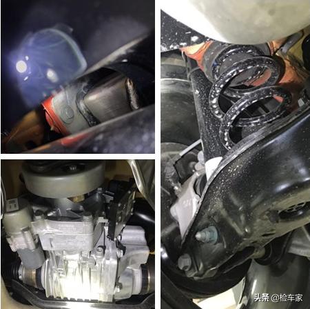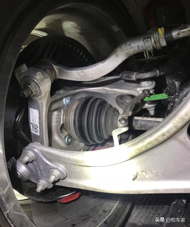 车子才1千公里,护板还没有拆过,我只能通过缝隙对底盘部件进行检测,首先对前后悬挂的检测没有发现任何异常的拆卸及变形修复迹象,螺丝无任何拆卸痕迹,各个球头也均无漏油渗油迹象。