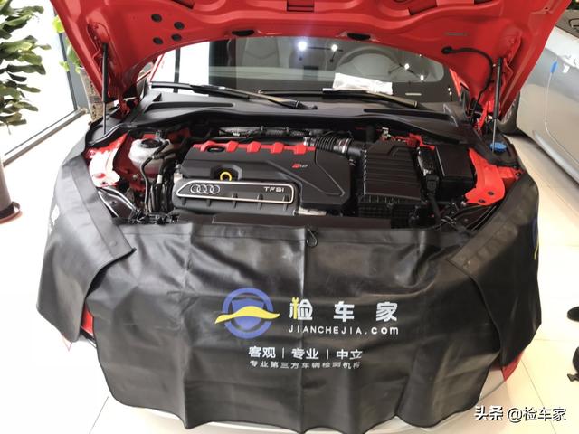 接下来开始对发动机舱进行检测,看一下机舱目前状况如何,是不是存在问题。TT RS搭载一台2.5T直列五缸发动机,400匹马力,3.7秒的加速成绩。在这还是要提一句五缸的车子一直都是很少见的,估计这也是我们的这位粉丝选择它的一个重要的理由吧,国内百万以下车子可以说是没有对手。机舱整体看上去很干净,没有发现损伤。