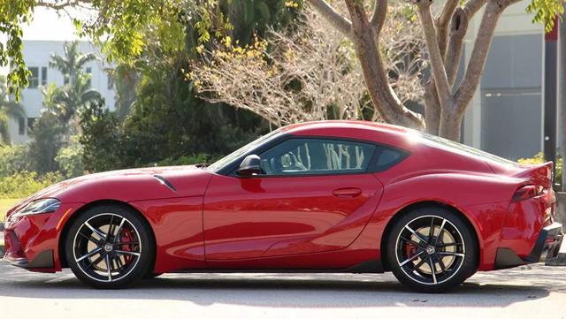 车侧部分,新车车身尺寸为4250/1780/1315mm,轴距为2570mm,其溜背造型更加修长,配合上车尾部分向上隆起的小鸭尾,全新丰田86侧面流畅感更足。值得一提的是,新车车门后的造型采用与Supra相同的向外隆起设计,营造出更强烈的运动感。
