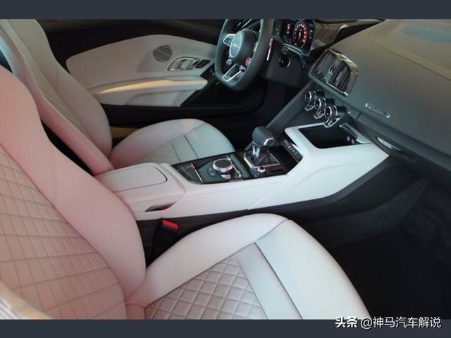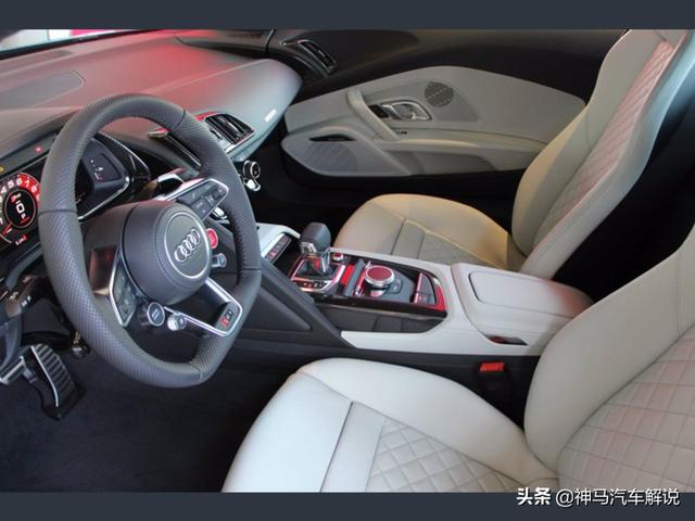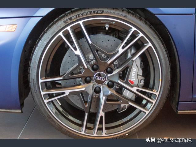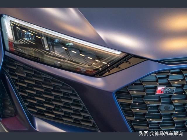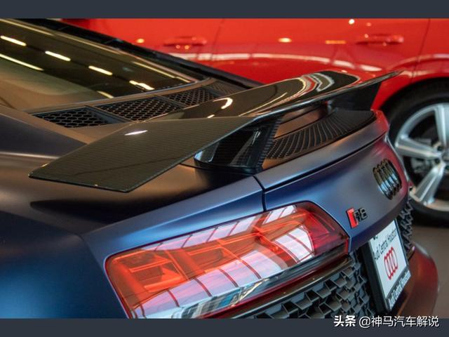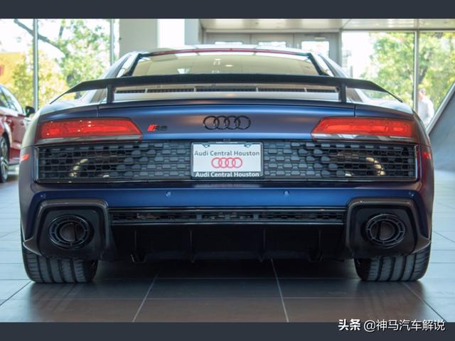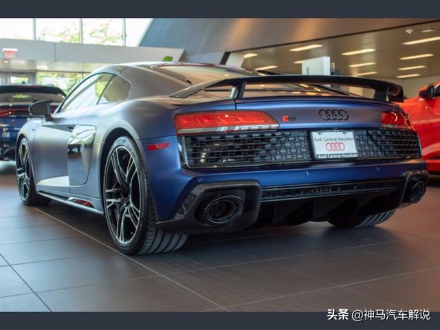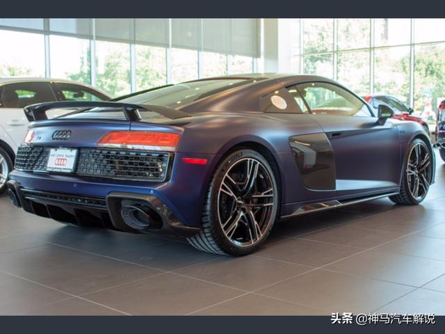 新款 奥迪R8 ,定位跑车,海外实拍。外观采用蓝色涂装,前脸采用家族式的设计语言,低矮的车头非常有冲击性,进气格栅采用六边形造型,中网采用蜂窝状的设计,前大灯采用犀利个性的造型,日间行车灯点亮后效果出色,前包围设计运动。侧面车身比例协调,车顶线以及窗线流畅清晰,无边框车门设计时尚,后视镜设计精致,轮拱造型很有立体感,轮毂采用独特时尚的造型。尾部夸张的尾翼很有运动感,尾灯采用潮流时尚的造型,排气采用双边共两出的设计。内饰采用家族式的设计风格,方向盘造型运动,仪表显示信息丰富,按键阻尼适中,档把手感细腻,座椅包裹性好,做工精细,用料考究。