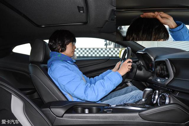 第六代科迈罗虽然缩小了车身尺寸,但其空间布局较为合理,使得前排进出都十分方便。体验者身高183cm,将座椅调到最低,保持合理的前后距离,此时所能够获得的头部空间为2指。