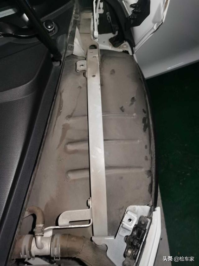 两侧的翼子板固定螺丝也没有拆卸拧动痕迹,左右两侧的翼子板内衬和支架没有发现有钣金、变形的情况。