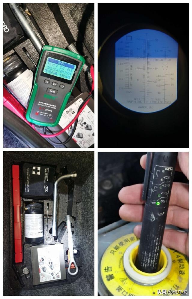 电瓶检测也是正常,刹车油检测含水量正常,液位高度正常,随车工具也都齐全没有使用痕迹,前部基本上没有发现异常情况,车况十分优秀。