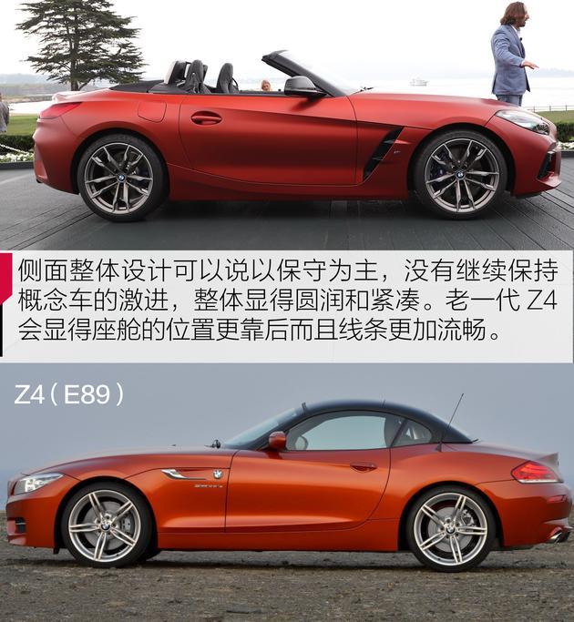 从侧面造型来看,新车除了增加夸张都空气学导流口,其实侧面线条在笔者看来反而没有上一代好看,更加圆润以及紧凑都风格失去了E89上面的线条流畅感。除此之外,新车并没有继续采用概念版车型的外后视镜、双驼峰的防滚架等激进的造型,总体设计还是趋于传统且保守。