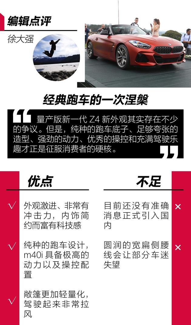 总结:如果新一代宝马Z4引进到国内,可以说让原来比较沉闷的入门级跑车市场再次注入强劲的活力。入门级的跑车之所以经典,因为他们更亲民的售价可以让更多人体验纯种跑车带来的乐趣。全新一代宝马Z4拥有不错的产品力,期待我们可以在国内进行深度的试驾。(摄:海外报道团队 图/文:徐永强)