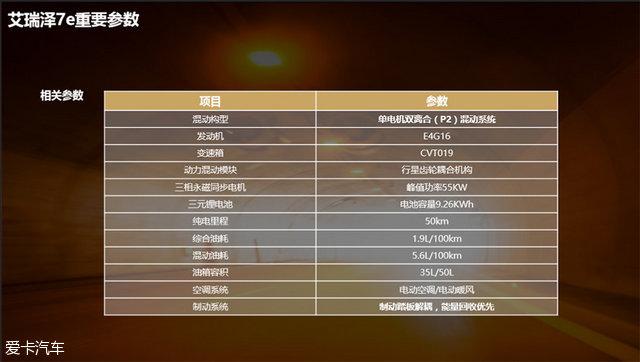 首先罗列一下这套系统的主要数据:三元锂电池容量为9.26kWh,可以支持以纯电动模式行驶50km,电动/发电机功率55kW,这样的数据正好满足了国家新能源目录对于插电式混合动力车型的标准。而有趣的是,艾瑞泽7e油箱有50L和35L两个版本,其中35L的油箱正好符合上海市对于插电式混合动力车型的新规定,可以享受牌照和补贴优惠。