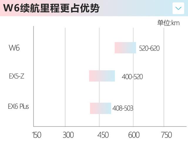 尺寸方面,威马W6长宽高分别为4620×1847×1730mm,轴距为2715mm,整体尺寸表现介于EX5-Z与EX6 Plus之间。动力续航方面,新车采用了永磁同步电机搭配三元锂电池的组合,最大功率为160kW,最大扭矩225Nm,NEDC最大续航里程为620km,远超EX5-Z以及EX6 Plus。