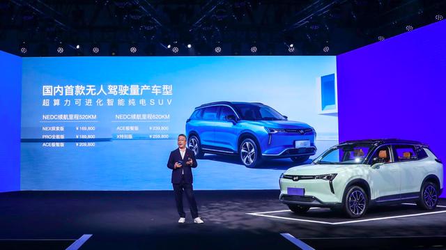 新车共推出5款车型,分别为NEDC续航标准下,520km版和620km版。520km版共包括3款车型:NEX探索版,售价为16.98万元。PRO全能版,售价为18.98万元。ACE极智版,售价为20.98万元。而620km版则有两款车型,分别为ACE极智版,售价为23.98万元。X特别版,售价为25.98万元。