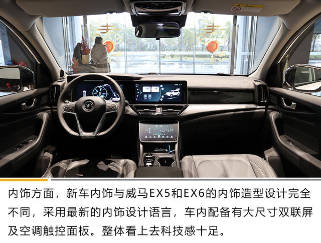 内饰方面,新车内饰与威马EX5和EX6的内饰造型设计完全不同,采用最新的内饰设计语言,车内配备有大尺寸双联屏及空调触控面板。整体看上去科技感十足。