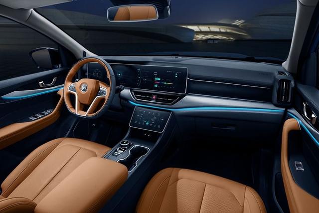 内饰的颜值同样很高——除入门级为黑色外,其余各款均为双色内饰。棕色皮革与黑色亮面搭配,显得颇为雅致。此外,中配以上车型,配有32色氛围灯,晚上更漂亮。