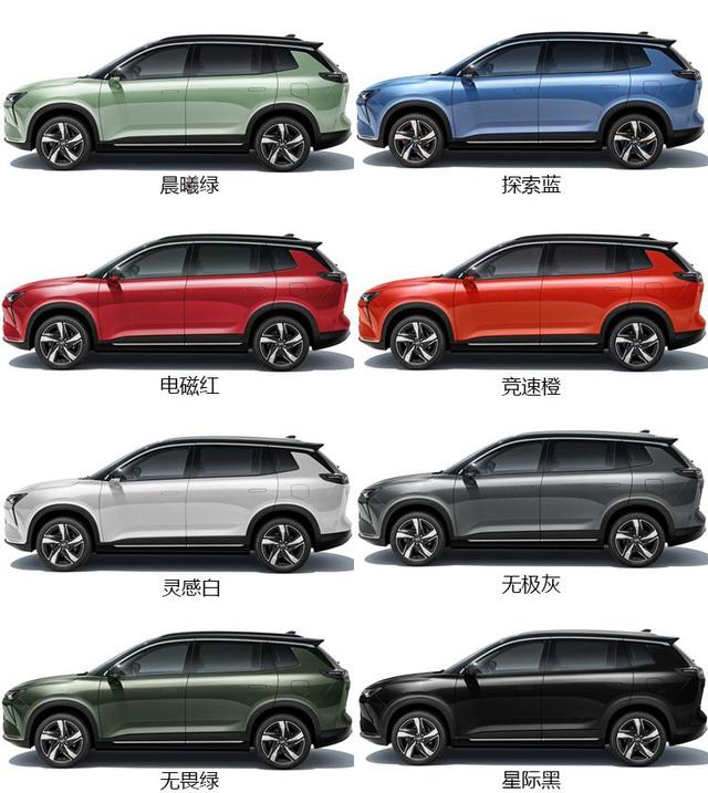 先看颜色,它的车身分为绿、蓝、红、橙、白、灰、黑等8种。尤其是前4种车色,显得格外靓丽。其中,晨曦绿是代言人钟楚曦的专属配色,也是威马W6的独有。