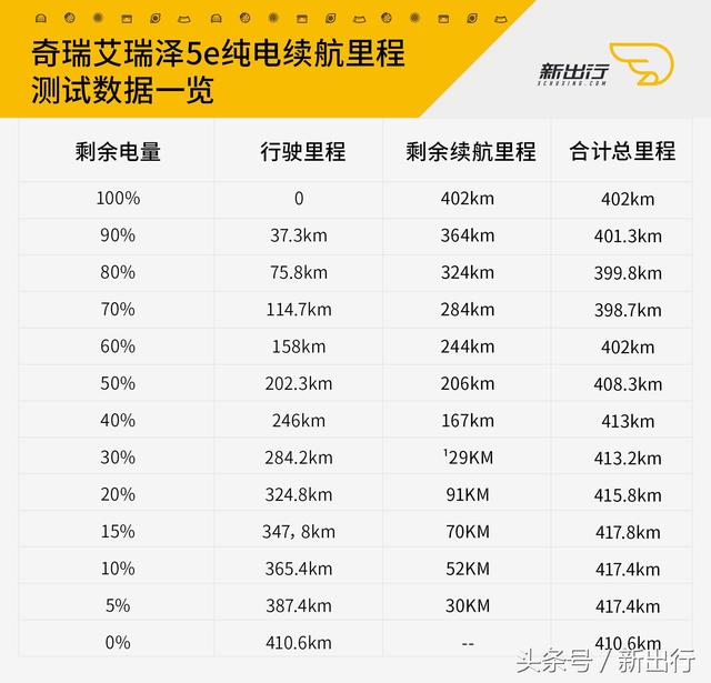 在这次的体验中,我们也做了最大续航测试,用较为极限的驾驶方法(不开空调、保持 40-60km/h 等速巡航),最终在剩余电量为 0% 的情况下一共行驶了 410.6km,而此时车辆还能继续行驶。据工程师透露,实际上此时车辆还剩余 5% 左右的冗余电量,以极限驾驶方法还能行驶 20-30km 左右,相当于实际艾瑞泽 5e 的最大续航可以达到 440km 左右。