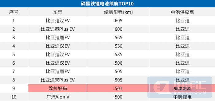 而搭载磷酸铁锂电池的车型续航里程也并不少,最新申报的车型续航里程大多也能超过500km,而目前续航里程最高的10款车型中,比亚迪独占了8款,均用的是比亚迪刀片电池,最高续航里程已经达到了605km,已经完全赶上了搭载高能量密度三元电池的车型。