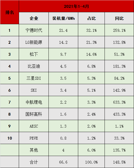公开数据显示,今年1-4月宁德时代的动力电池装机量为21.4GWh,市场份额高达32.5%,远超LG新能源21.5%的全球市场占有率。而且,除了宁德时代,比亚迪、中航锂电、国轩高科等动力电池供应商都跻身全球前十行列,今年第1季度,中国动力电池厂商的全球市场份额达45.0%,占据全球市场的半壁江山。