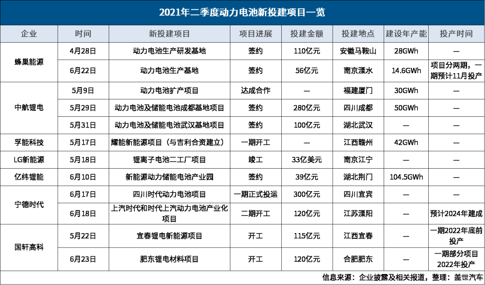 为了缓解市场焦虑,一季度国内动力电池企业纷纷有所行动,其中,宁德时代、中航锂电、亿纬锂能分别投资395亿、100亿、39亿元用于产能扩建等,国内新投建项目超过了20个,建设产能超过350GWh。到了二季度,动力电池新一轮扩产竞赛仍在继续。
