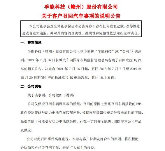 这个消息一出,市场上就有人把矛头直指宁德时代,宁德时代股价大跌6.51%,市值缩水超860亿元,后来宁德时代出面否认,才算告一段落;后来又牵扯出"科创板动力电池第一股"孚能科技,孚能科技作出回应,称欧拉IQ的BMS系统并非孚能供应,公司仅供应了召回车辆所搭载的电池模组。但根据欧拉方面的说法,BMS系统虽然是第三方供应,但其控制策略是由长城汽车和孚能科技共同制定验证的,因此具体责任比例应该由长城与孚能协商解决。