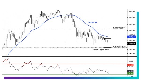 CoinDesk撰稿人Damanick Dantes对此认为,比特币下一个支撑位将在27000美元。从技术方面看,根据盘中图表显示,目前比特币处于超卖状态,这可能将稳定部分抛售压力。不过,由于上方阻力较大,比特币上行空间似乎限制在34000美元以下。