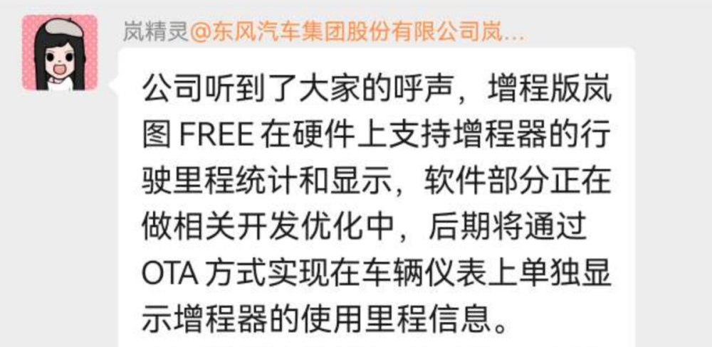 岚图FREE增程版在硬件上本身是支持增程器行驶里程数统计和显示功能的,不过此前并没有做出对应的优化和升级。在用户反馈之后,岚图品牌已经开始进行相对应的软件开发优化,后期会通过OTA的方式,实现在车辆仪表盘上单独显示增程器使用的里程信息这一功能。