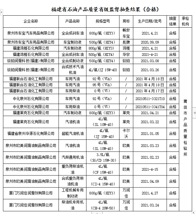 近期,依据《中华人民共和国产品质量法》,福建省市场监督管理局组织对石油产品开展产品质量省级监督抽查,抽查产品包括车用汽油、车用柴油、汽油机油、柴油机油、机动车辆制动液,共抽查9家生产企业20批次产品,合格率为100%。