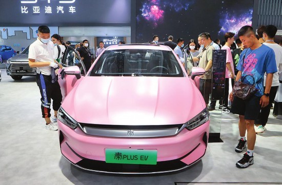 本届汽博会上,国产新能源汽车凭借时尚的外观和超高的性价比,获得了车迷们的广泛青睐。 (记者 丁研 摄)