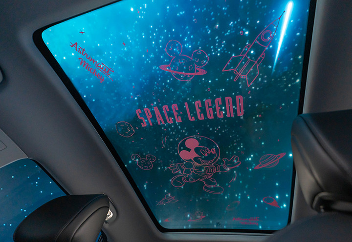 外观方面,与米奇魔法版一样,米奇太空版也是在车身上增加了专属的拉花和徽标,增加了车辆辨识度,来体现该车的专属身份。车身拉花融入宇宙、星空等元素,配以Menlo Adventure徽标和宇航员米奇头像,使整车更具探险气息;此外,在该车的全景天幕上还布满太空和宇航员米奇的图案,营造出太空旅行的即视感。