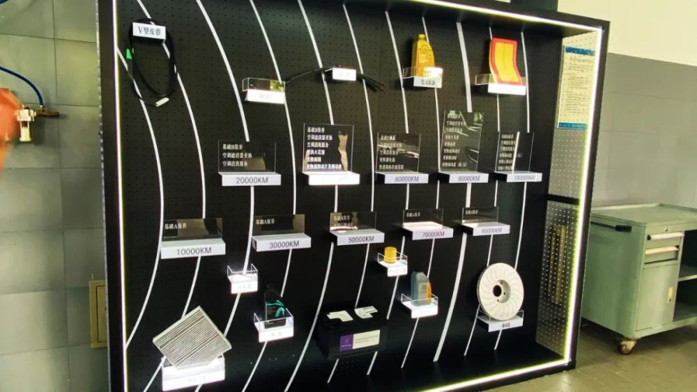 所以在店里,我看到一些旨在为了消除这些不对称不透明不全面的细节,包括一进店内随处可见的“服务公约”和“待客之道”,包括在维修接待区域内的轮胎解剖展示区(用以展示轮胎构造、什么情况下更换以及轮胎的一些使用常识),还有常见耗材的展示区域(不仅展示了这个耗材长什么样子,还明确标注了它的使用寿命和厂家建议的更换公里数)。