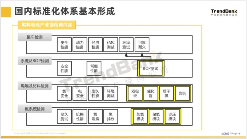 中国燃料电池检测行业标准化工作进展逐渐加快,国内标准化体系基本建立成型,在缺失的BOP标准化文件方面也已经在预研或即将立项发布;