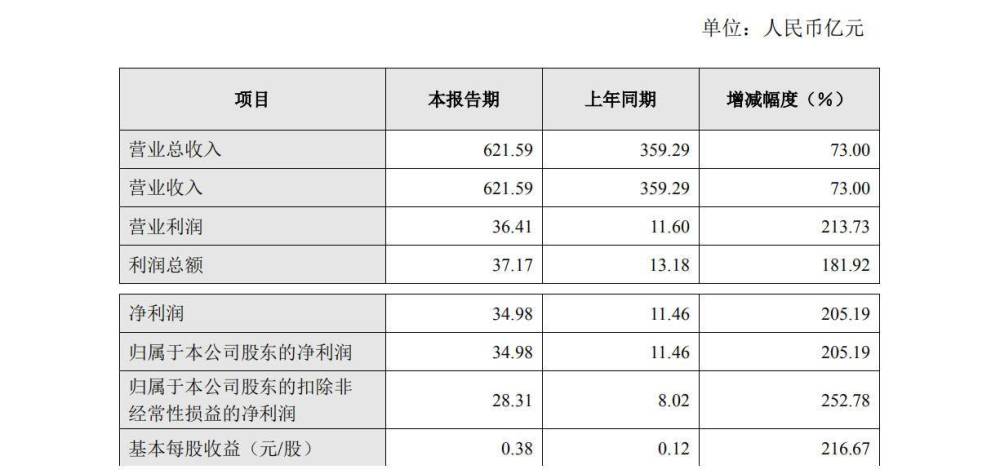 近日,长城汽车股份有限公司发布2021年中期业绩快报。财报显示,2021年上半年,长城汽车营业总收入621.59亿元,同比增长73%,净利润34.98亿元,同比劲增205.19%。基本每股收益0.38元。