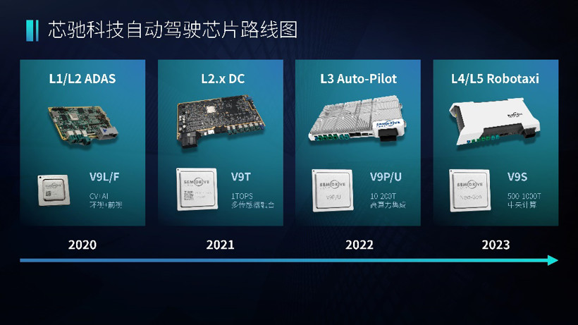 针对未来高等级自动驾驶的发展,芯驰科技计划自2021年起,面向L2.x DC、L3 Auto-Pilot、L4/L5 Robotaxi,逐年推出V9T、V9P/U、V9S芯片。