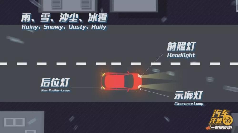 法律规定:机动车在雨、雪、沙尘、冰雹等情况下行驶时,通常只需开启前照灯、示廓灯和后位灯。