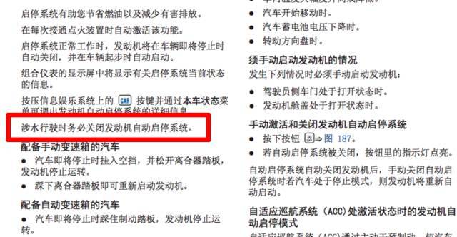 这个几乎是老司机的共识。并不是说,涉水时开启“自动启停”,车就百分百会挂。但是遇到路面积水,还是强烈建议关闭,而且很多车的说明书中也有明确标注: