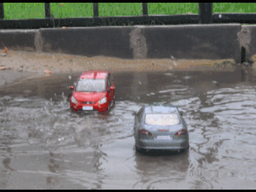 而且,要避免和其他车辆同时进入积水区域,因为车辆扬起的水浪也是非常危险的。如果对面有来车,大家谦让一下,一个一个过。