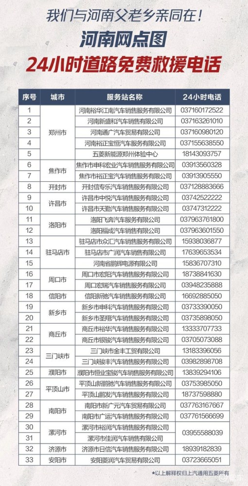 最后,上汽通用五菱还公布了河南升内网点的服务站名称,以及24小时电话,此举意味着客户们,可以根据需要拨打24小时道路免费救援电话,在保证双方安全的前提下,获得最大限度的救援帮助。