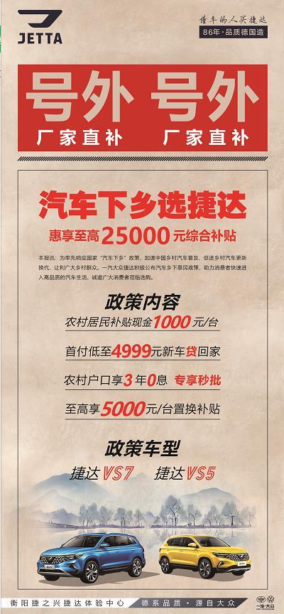 据悉,捷达为衡阳市民准备的购车好礼包括:至高享36期0息,首付低至4999全包贷回家;农村户口专享1000元下乡补贴,置换至高补贴5000元;更有10台厂家直供车限时88折秒杀,购特供车送2年4次常规保养;如车展期间老客户介绍新客户成功购买任意车型,老客户享至高1000元油卡,新客户赠送保养一次