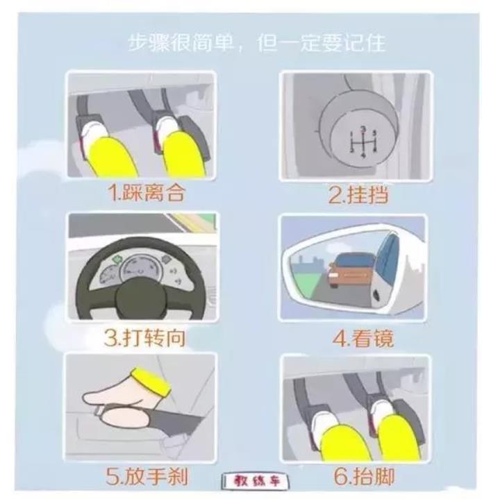 正式路考前,先绕车一-周检查一下, 起步时记住一个口诀: -踩离合、二挂挡、三打转向、四看镜、五松手刹、六抬脚。