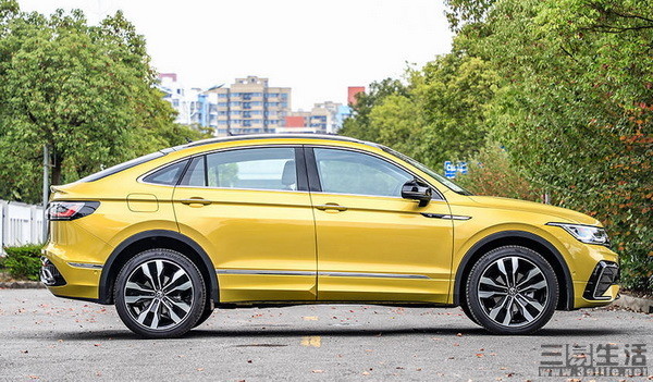 车身侧面的平直腰线贯穿车身前后,略微凸出的前后翼子板配合黑色轮眉,呈现出小宽体的视觉效果,配合双五辐式大尺寸的轮圈造型,带来不错的视觉效果。