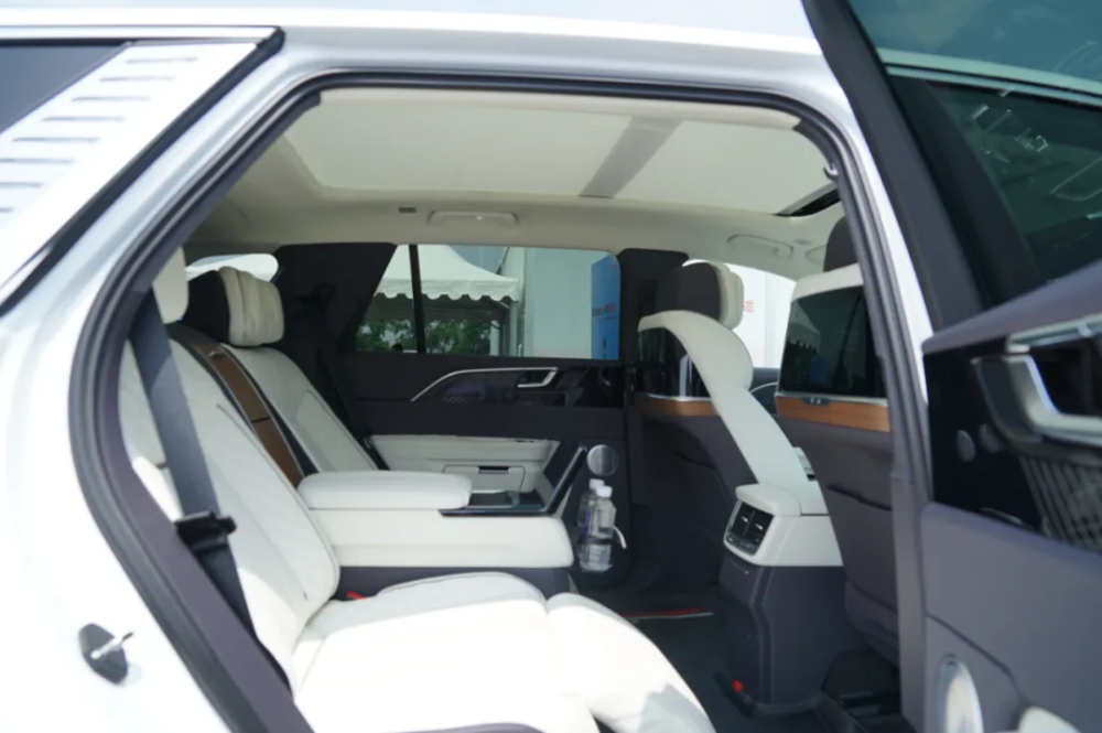 座椅整体给我的感觉,就是宽厚,坐起来很舒服,加上车内空间大。第二排配备座椅加热和通风,独立空调,配有220V电源、12V电源、USB接口,出行和商务都十分方便了。我们这一次试驾的是4座版本,第二排的空间就很大,这台车还有6座版本,我个人体验了4座,感觉这个符合它的定位。