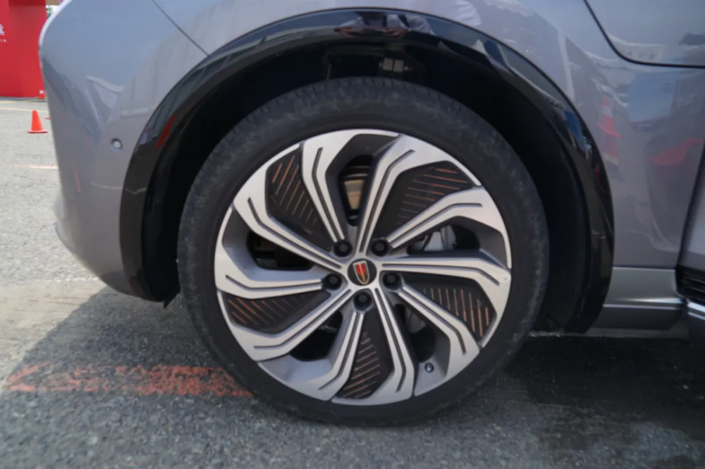 前翼子板与前门之间贯穿红色饰条,这些都是红旗的设计,但是用料和组合,看起来没有那么高级。轮圈部分也采用了低风阻的设计,造型就显得不那么大气了,轮胎是采用米其林PS4轮胎,这么大的车型,讲究性能的确是没有实际意义。我们说一点不一样的,C柱银色的设计,在这台车上,让它显得精致了不少,能显示电量相关信息。