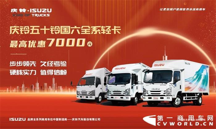 据悉,7月1日-31日期间,凡购买庆铃五十铃全系国六轻卡,可享受最高7000元优惠。同时针对M系列车型,庆铃五十铃还向消费者量身定制“0首付、0手续费、低利率、高贴息”等有竞争力的金融产品,进一步降低购车成本。并且,庆铃全国经销商还准备了丰富多样的到店礼、精品礼、幸运礼、保养礼等惊喜大礼包,此时高端国六轻卡最佳购车时机不容错过。