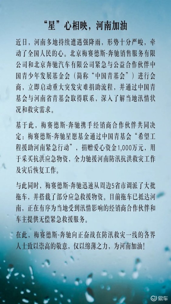 在此,梅赛德斯-奔驰向正奋战在防汛救灾一线的各界人士致以崇高的敬意,仅以绵薄之力,为河南加油!
