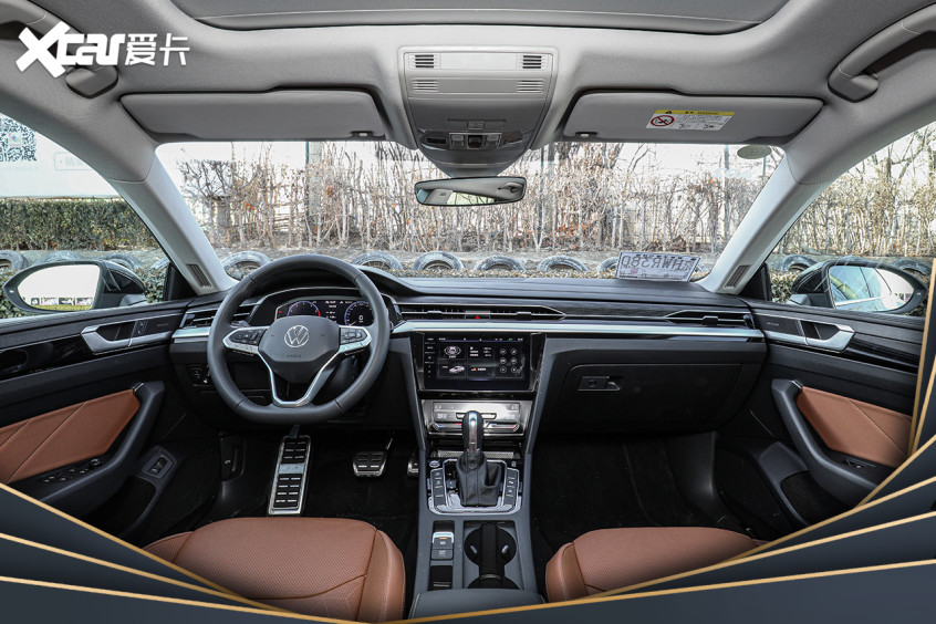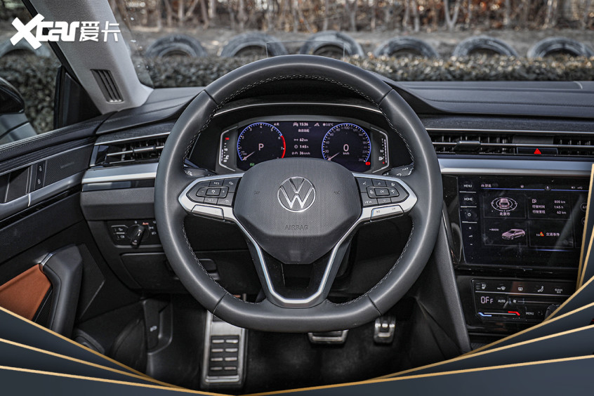 不过,来到CC猎装车的车内,内饰设计的确是稍显老气了。棕黑配色的内饰看上去并不像外观一样年轻和时尚,好在全新的家族式运动方向盘造型、带手势控制功能的中控大屏等配置,让内饰看起来并不会显得很古板、很大众。